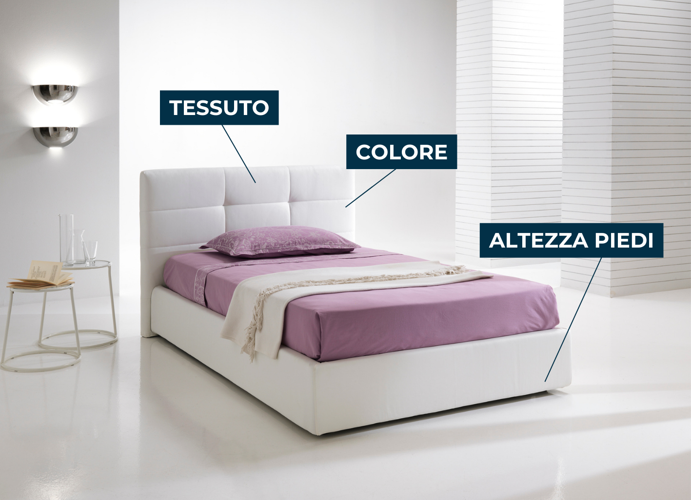 Dopo aver scelto modello e misura, personalizza il letto a tuo piacimento: scegli tessuto, colore e altezza dei piedi in base alle tue necessità.